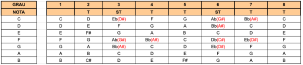 - As notas Ré(D) e Ré sustenido(D#) aparecem no segundo e terceiro grau. Então a nota Ré sustenido(D#) é trocada por a Mi bemol(Eb);