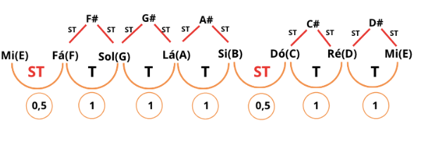 Você conseguiu perceber como essas duas notas soam bem quando tocadas uma após a outra ou até mesmo juntas? Esse intervalo tem 5 notas e 3,5 tons, resultando em uma quinta justa de consonância perfeita. Confira na figura abaixo.