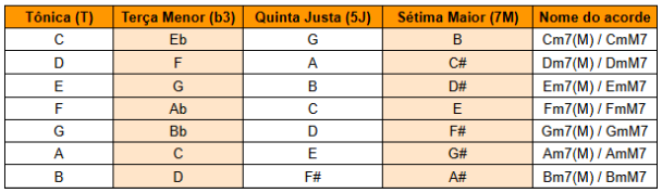 A combinação da terça menor com a sétima maior cria um som bastante dissonante e tenso, diferente do que estamos acostumados a ouvir nos acordes maiores com sétima menor.